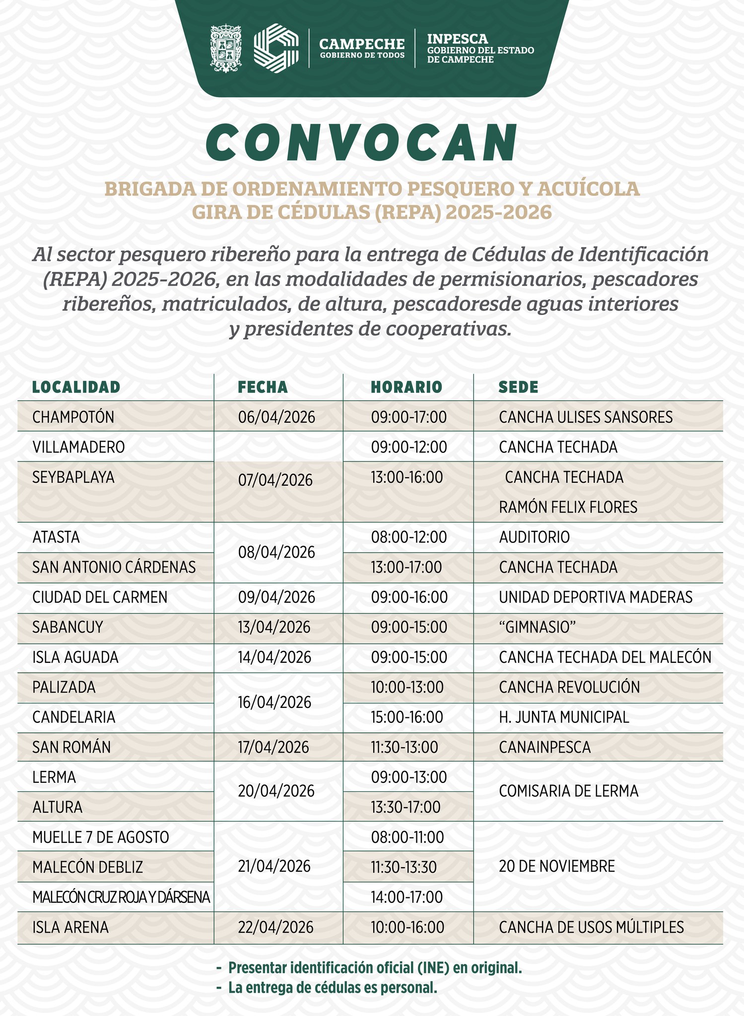 Entrega de cédulas REPA (Registro Estatal de Pesca y Acuacultura) 2025-2026 en Isla Aguada. LEER MÁS Instituto de Pesca y Acuacultura del Estado de Campeche Calle 10 Numero 338, Barrio de San Román, C.P. 24040,Campeche, Campeche. Tel (981) 132 0020inpesca@campeche.gob.mx Horario de atención: 8:30 a 14:30 hrs. de lunes a viernes, días hábiles